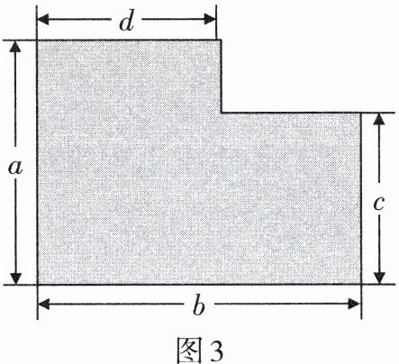 5. 如图3,用含$ a $,$ b $,$ c $,$ d $的代数式表示出图中阴影部分的面积(至少写出两种不同的方法),并分别计算出当$ a = 7 $,$ b = 9 $,$ c = 5 $,$ d = 5 $时,所用不同方法表示的阴影部分面积是多少?