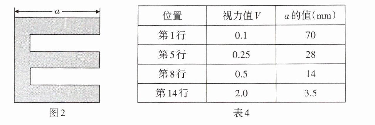 4. 已知,视力表上视力值V和字母E的宽度a(mm)是反比例关系,字母E的宽度a如图2.经整理,视力表上部分视力值V和字母E的宽度a(mm)的对应数据如表4: