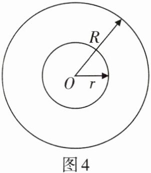 1. 图4是一个圆环,外圆和内圆的半径分别是$R和r$,(1)用代数式表示圆环面积;(2)当$R = 5\ cm$,$r = 2\ cm$时,圆环的面积是多少($\pi取3.14$)?