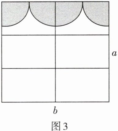 4. 小明房间的窗户如图3所示,其中上方的装饰物由两个四分之一圆和一个半圆组成,他们的半径相同,用含有$a$,$b$的代数式表示窗户中透光部分的面积是