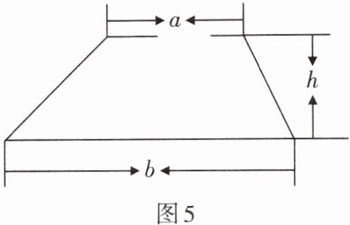 2. 如图5,堤坝的横截面是梯形,测得梯形上底为$a = 18\ m$,下底$b = 36\ m$,高$h = 20\ m$,用代数式表示这个梯形的面积,并求出它的面积是多少?