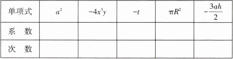 单项式 $a^{2}$ $-4x^{3}y$ $-t$ $\pi R^{2}$ $-\frac{3ah}{2}$