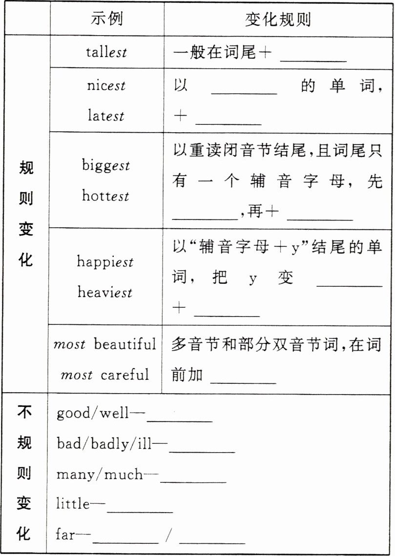 1. 规则变化 tallest 一般在词尾+est nicest latest 以不发音e结尾的单词,+st biggest hottest 以重读闭音节结尾,且词尾只有一个辅音字母,先双写该辅音字母,再+est happiest heaviest 以“辅音字母+y”结尾的单词,把y变i+est most beautiful most careful 多音节和部分双音节词,在词前加most 不规则变化 good/well—best bad/badly/ill—worst many/much—most little—least far—farthest/furthest