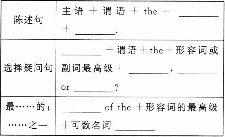 1. 观察 page 35 - 3a 表格中的句子,圈出含有最高级的词汇,并根据其变化特点,将变化规则填写到下列表格里。