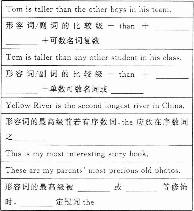 4. 陈述句 主语+谓语+the+形容词最高级+范围. 选择疑问句 特殊疑问词+谓语+the+形容词或副词最高级+A,B or C? 最……的;……之一 one of the +形容词的最高级+可数名词复数 形容词或副词的比较级表示最高级: Tom is taller than the other boys in his team. 形容词/副词的比较级+than +the other+可数名词复数 Tom is taller than any other student in his class. 形容词/副词的比较级+than +any other+单数可数名词或不可数名词 Yellow River is the second longest river in China. 形容词的最高级前若有序数词,the 应放在序数词之前 This is my most interesting story book. These are my parents' most precious old photos. 形容词的最高级被物主代词或名词所有格等修饰时,不加定冠词the