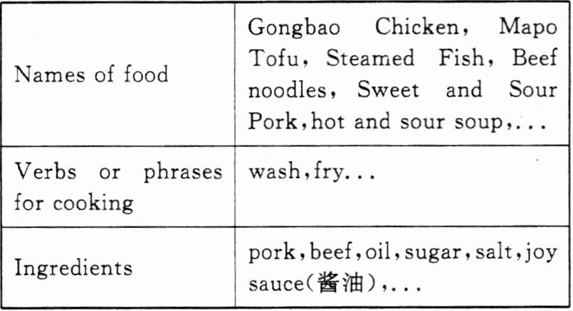 Names of food: Fried Rice, Dumplings, Egg Soup, Tomato and Egg Noodles, Braised Pork...; Verbs or phrases for cooking: cut, boil, steam, mix, add, cook, stir-fry, bake...; Ingredients: chicken, tofu, fish, noodles, eggs, tomatoes, rice, flour, vinegar, pepper...