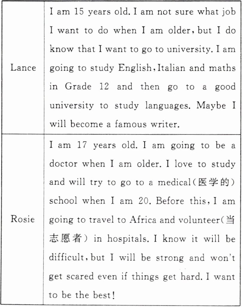 | Rosie | I am 17 years old. I am going to be a doctor when I am older. I love to study and will try to go to a medical(医学的) school when I am 20. Before this, I am going to travel to Africa and volunteer(当志愿者) in hospitals. I know it will be difficult, but I will be strong and won’t get scared even if things get hard. I want to be the best! |