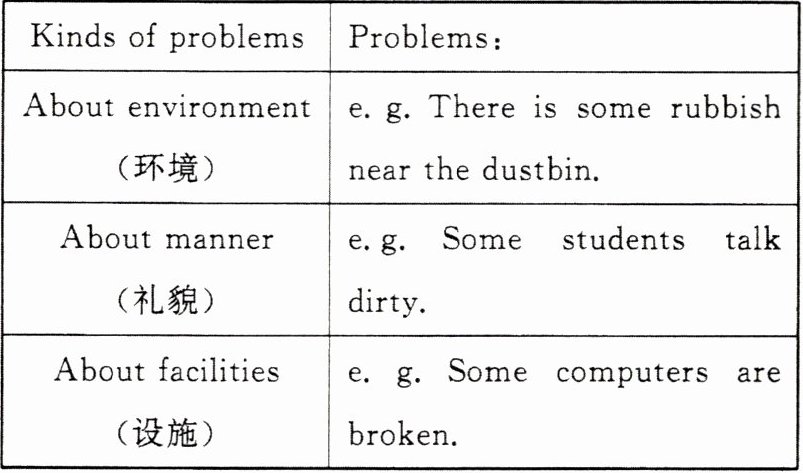 课堂练习 ▲活动中:1. 答案不唯一,合理即可 Problems Reasons why these problems exist There are some scribbles on the walls. Some students don't realize the importance of protecting the school environment and don't follow the rules. Some students fight with others. They are not polite and kind and they don't think about others and can't communicate with others properly. Some computers are broken. Some students don't protect them, and even broke them. 2. 答案不唯一 3. 答案不唯一 ▲活动后:略
