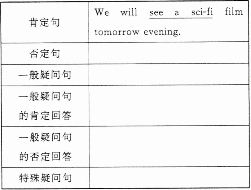 | 肯定句 | We will see a sci-fi film tomorrow evening. |