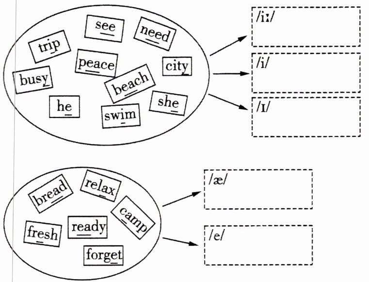 /i:/: he, she, see, need, beach, peace /ɪ/: trip, swim /i/: city, busy /æ/: camp, relax /e/: fresh, forget, bread, ready