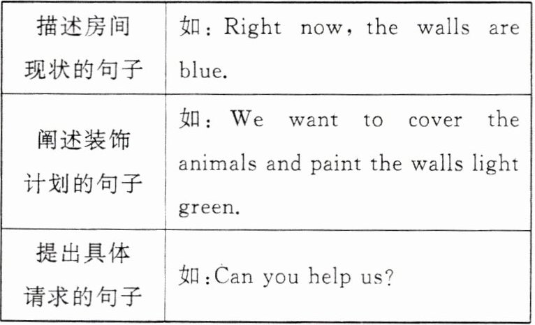 |阐述装饰计划的句子|如:We want to cover the animals and paint the walls light green.|