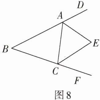 5. 如图8,在△ABC中,∠B= 47°,外角∠DAC和∠ACF的平分线交于点E,则∠AEC= ______.