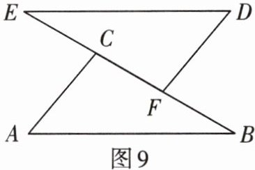1. 如图9,$\triangle ABC\cong\triangle DEF$,$\angle B= 30^{\circ}$,$\angle A= 50^{\circ}$,$BF= 2$,求$\angle DFE的度数与EC$的长。