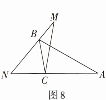 5. 如图8,已知$N$,$C$,$A$三点在同一直线上,在$\triangle ABC$中,$\angle A:\angle ABC:\angle ACB= 3:5:10$。若$\triangle MNC\cong\triangle ABC$,则$\angle BCM$的度数为______。