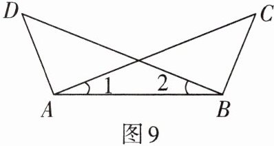 1. 如图9,$AC = BD$,$\angle 1 = \angle 2$. 求证:$\angle DAC = \angle DBC$.