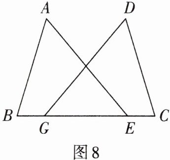 1. 如图 8,点$G$,$E在BC$上,$BG = CE$,$AB = DC$,$AE = DG$. 求证:$\angle B = \angle C$.