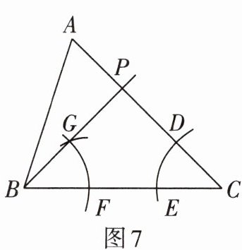 4. 如图7,在△ABC中,按以下步骤作图:①以点C为圆心,任意长为半径画弧,分别交AC,BC于点D,E;②以点B为圆心,CE长为半径在∠CBA内画弧,交BC于点F;③以点F为圆心,ED长为半径画弧,两弧交于点G;④作射线BG交AC于点P.若∠C=45°,∠A=60°,则∠ABP的度数为