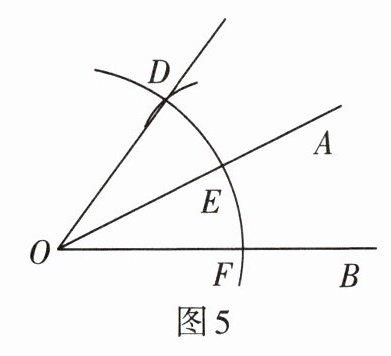 2. 如图5,已知∠AOB,以点O为圆心,任意长度为半径画弧,分别交OA,OB于点E,F,再以点E为圆心,EF的长为半径画弧,交前弧于点D,画射线OD.若∠AOB=27°,则∠AOD的度数为
