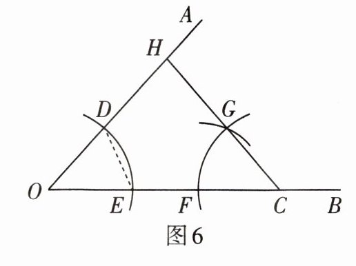 3. 如图6,已知∠AOB=48°,点C为射线OB上一点,用尺规按如下步骤作图:①以点O为圆心,以任意长为半径作弧,交OA于点D,交OB于点E;②以点C为圆心,以OD长为半径作弧,交OC于点F;③以点F为圆心,以DE长为半径作弧,交前面的弧于点G;④连接CG并延长交OA于点H.则∠AHC的度数为