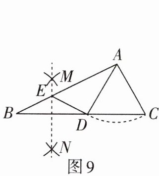 5. 如图9,在△ABC中,以点A为圆心,AC的长为半径作圆弧交BC于点D,再分别以点B和点D为圆心,大于$\frac{1}{2}BD$的长为半径作圆弧,两弧分别交于点M和点N,连接MN交AB于点E。若AB= 10,AC= 7,BC= 12,则△AED的周长为______。