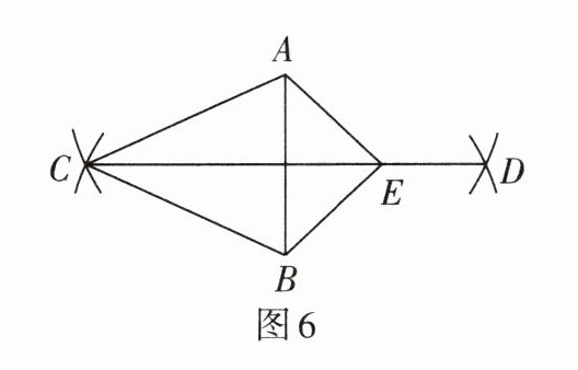 2. 如图6,已知线段AB,分别以点A,B为圆心,5为半径作弧相交于点C,D。连接CD,点E在CD上,连接CA,CB,EA,EB。若△ABC与△ABE的周长之差为4,则AE的长为______。