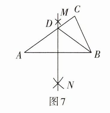 3. 如图7,在△ABC中,∠A= 35°,∠ABC的平分线BD交AC于点D,分别以A,B为圆心,以大于$\frac{1}{2}AB$的长为半径作弧,两弧交于点M和N,直线MN刚好经过点D,则∠C的度数是______。
