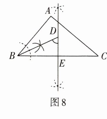 4. 如图8,在△ABC中,∠ABC= 50°,根据尺规作图痕迹,∠BDE的度数为______。