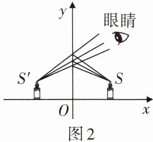 2. 如图2,这是平面镜成像的原理图.以桌面为$x$轴,镜面的侧面为$y$轴(镜面厚度忽略不计)建立平面直角坐标系.如果某刻火焰顶尖点$S的坐标是(8,4)$,那么此时对应的虚像顶尖点$S'$的坐标是______.