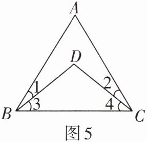 5. 如图5,$\angle 1= \angle 2$,$BD = CD$. 求证:$\triangle ABC$是等腰三角形. 下面是张强的证明过程,请你帮他注明理由: