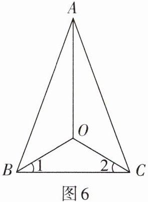 提示:由$\angle1=\angle2$得$OB=OC$,再证$\triangle ABO\cong\triangle ACO$,得$AB=AC$.
