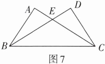 2. 在一次数学活动中,黑板上画着如图7所示的图形,活动前老师在准备的四张纸片上分别写有如下四个等式中的一个等式:①$AB = DC$;②$\angle ABE= \angle DCE$;③$AE = DE$;④$\angle A= \angle D$. 小明同学闭上眼睛从四张纸片中随机抽取两张. 请结合图形解答下列问题:当抽得①和②时,用①和②作为条件能判定$\triangle BEC$是等腰三角形吗?说说你的理由.