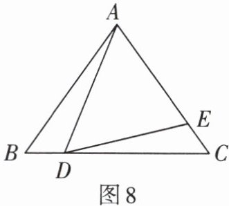 3. 如图8,在$\triangle ABC$中,$\angle B= \angle C = 55^{\circ}$,点$D是边BC$上的动点(点$D不与点B$、$C$重合),连接$AD$,作$\angle ADE = 55^{\circ}$,$DE与AC相交于点E$.