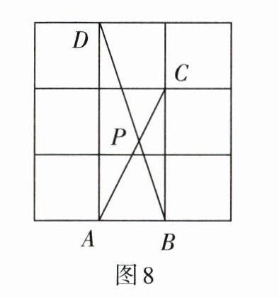 8. 如图8,在3×3的网格中,每一个小正方形的边长都是1,点A,B,C,D都在格点上,连接AC,BD相交于P,那么∠APB的大小是(