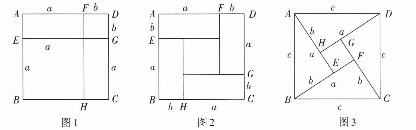 (1)如图2,正方形$ ABCD 是由四个边长分别为 a,b $的长方形和中间一个小正方形组成的,用不同的方法对图2的面积进行计算,你发现的等式是______(用$ a,b $表示);