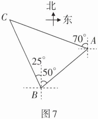 5. 如图7,某轮船于上午11时30分在$B处观测到海岛C在北偏西25^{\circ}$方向上,该轮船沿北偏东$50^{\circ}方向航行到A$处,在$A处观测到海岛C在北偏西70^{\circ}$方向上,则海岛$C处的\angle C$的度数为______。