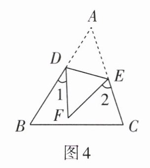 5. 如图4,将三角形纸片$ABC沿DE$折叠,点$A落在点F$处,已知$\angle 1 + \angle 2 = 100^{\circ}$,则$\angle A$的度数为( )
