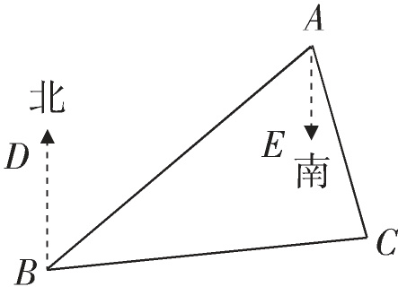 3. 如图9,$B处在A处的南偏西60^{\circ}$方向,$C处在A处的南偏东15^{\circ}$方向,$C处在B处的北偏东80^{\circ}$方向,求$\angle ACB$的度数。