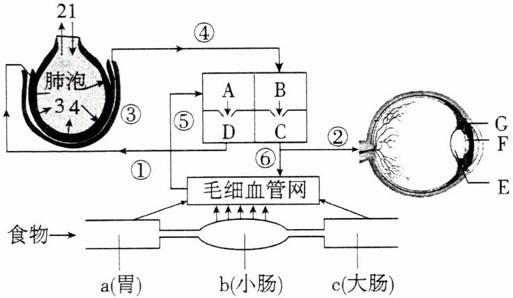 33. 户外环境中较高强度的光照,能有效延缓眼轴增长,降低近视发病率。因此,青少年应每天进行户外活动。下图表示人体部分生理活动,A~G代表器官中相关结构,a~c代表消化道的相关器官,1~4表示肺泡处气体交换,①~⑥表示相关血管。请据图回答下列问题: