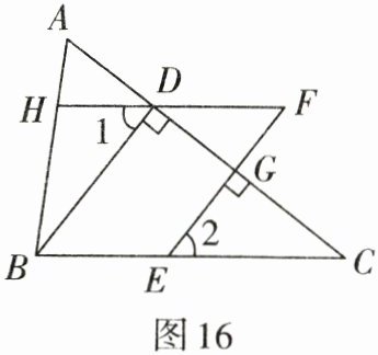 5. 如图16,$BD\perp AC$,垂足为点$D$,点$E$在$BC$上,$EF\perp AC$,垂足为点$G$,∠1=∠2.