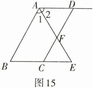 4. 如图15,$AB// CD$,$AE$平分∠$BAD$,$CD$与$AE$相交于$F$,∠$CFE$=∠$E$.