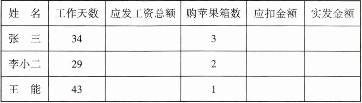 | 姓名 | 工作天数 | 应发工资总额 | 购苹果箱数 | 应扣金额 | 实发金额 |