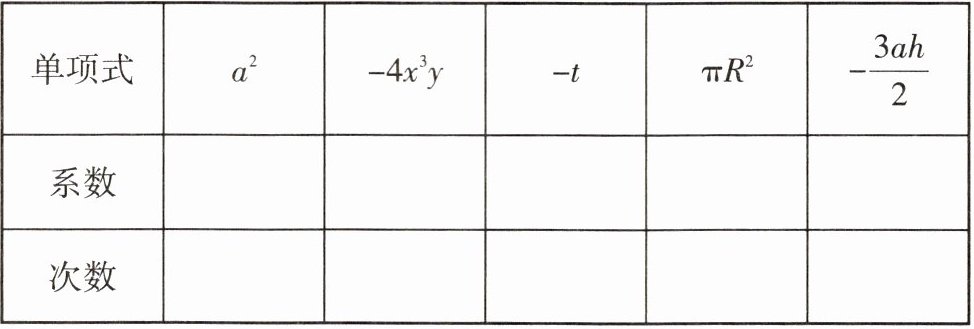| 单项式 | $a^{2}$ | $-4x^{3}y$ | $-t$ | $\pi R^{2}$ | $-\frac{3ah}{2}$ |