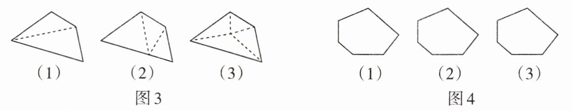 3. 阅读材料:多边形的一个顶点和其余与它不相邻的顶点的连线,多边形的某一条边上的一点(不与端点重合)与多边形各顶点的连线,多边形内部的一点与多边形各顶点的连线,都能将多边形分割成若干个小三角形. 图3给出了四边形的具体分割方法,分别将四边形分割成了2个,3个,4个小三角形,请你按照上述方法将图4中的六边形进行分割,并写出得到的小三角形的个数. 试把这一结论推广至n边形.