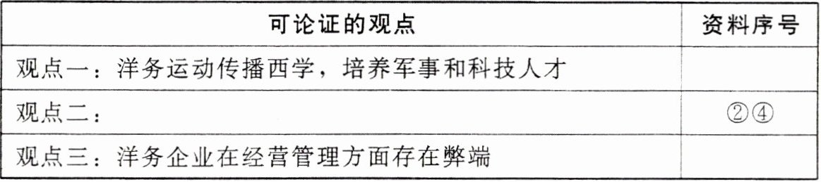 (2)观点一:①③;观点二:洋务运动对外国资本的入侵起到一定的抵制作用;观点三:⑤。