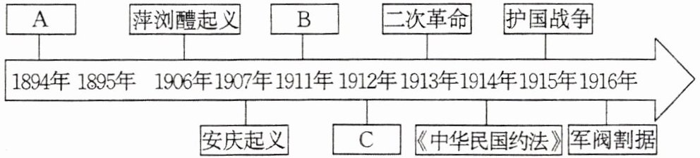 (3)在 A 处,孙中山建立的革命团体是什么?B 处发生了一场资产阶级革命,其指导思想是什么?C 处代表了孙中山领导的资产阶级民主革命的重要成果,该成果是什么?