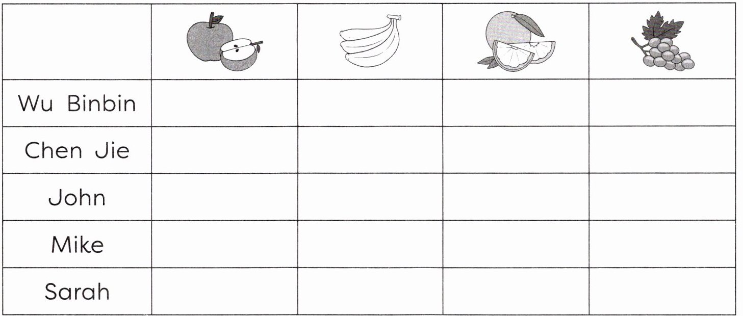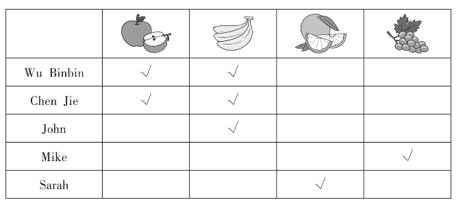 Ⅵ. Read and tick.(其他同学也在描述各自钟爱的水果,阅读对话内容,在表格中“√”出对应人物喜欢的水果。)