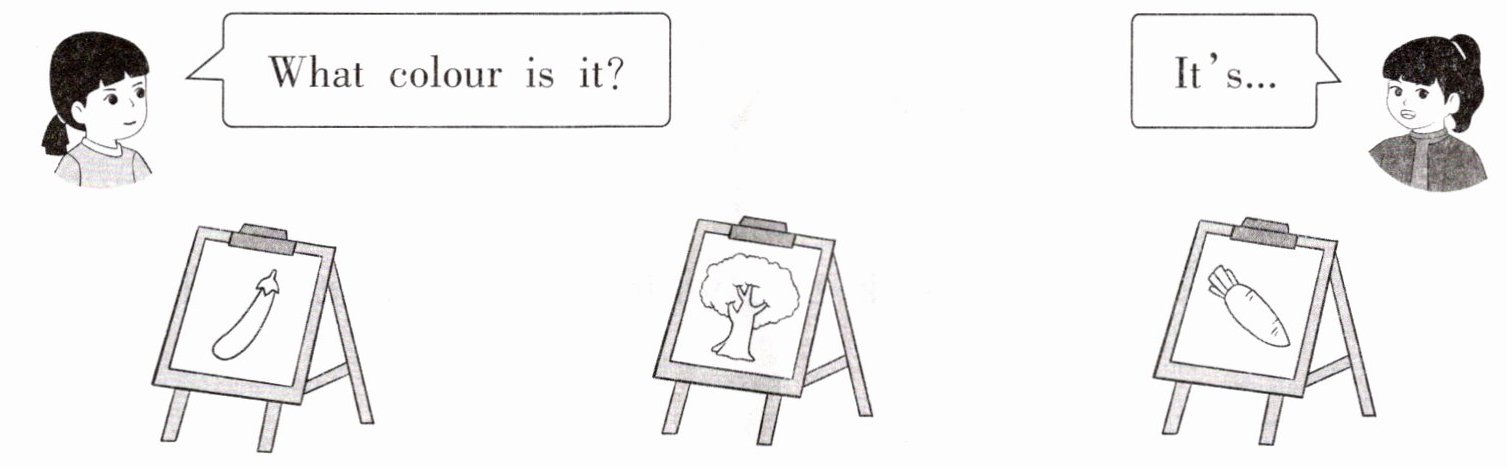 Ⅶ. Say and colour. (他们用调好的颜料画了下图。给下列水果图片涂上颜色,并用句子和图片模仿对话。)
