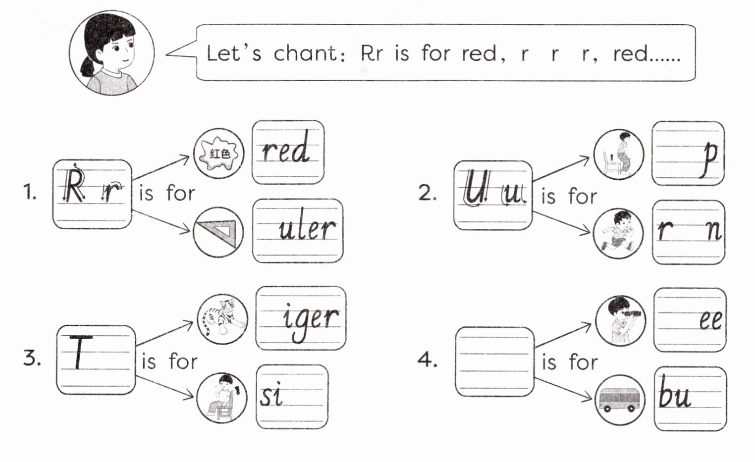 Ⅲ. Write and chant. (Sarah 玩游戏后需唱字母歌谣。看图,补全字母和单词,再唱一唱。)