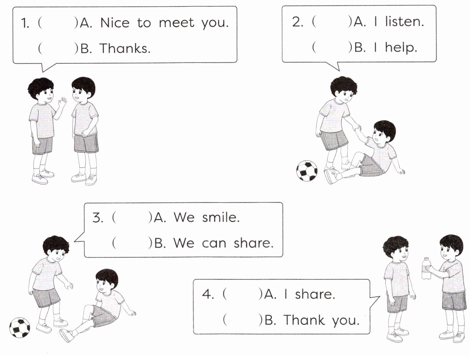 )A. Nice to meet you. ( )B. Thanks.2. ( )A. I listen. (