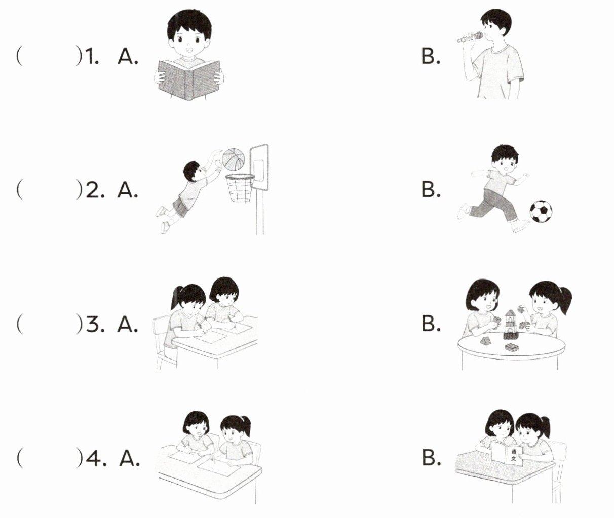 Ⅰ. Listen and choose. (主题班会的第二环节是手绘专属友谊海报。在手绘海报之前,同学们正在谈论一些关键信息。听录音,选出相应的图片。)